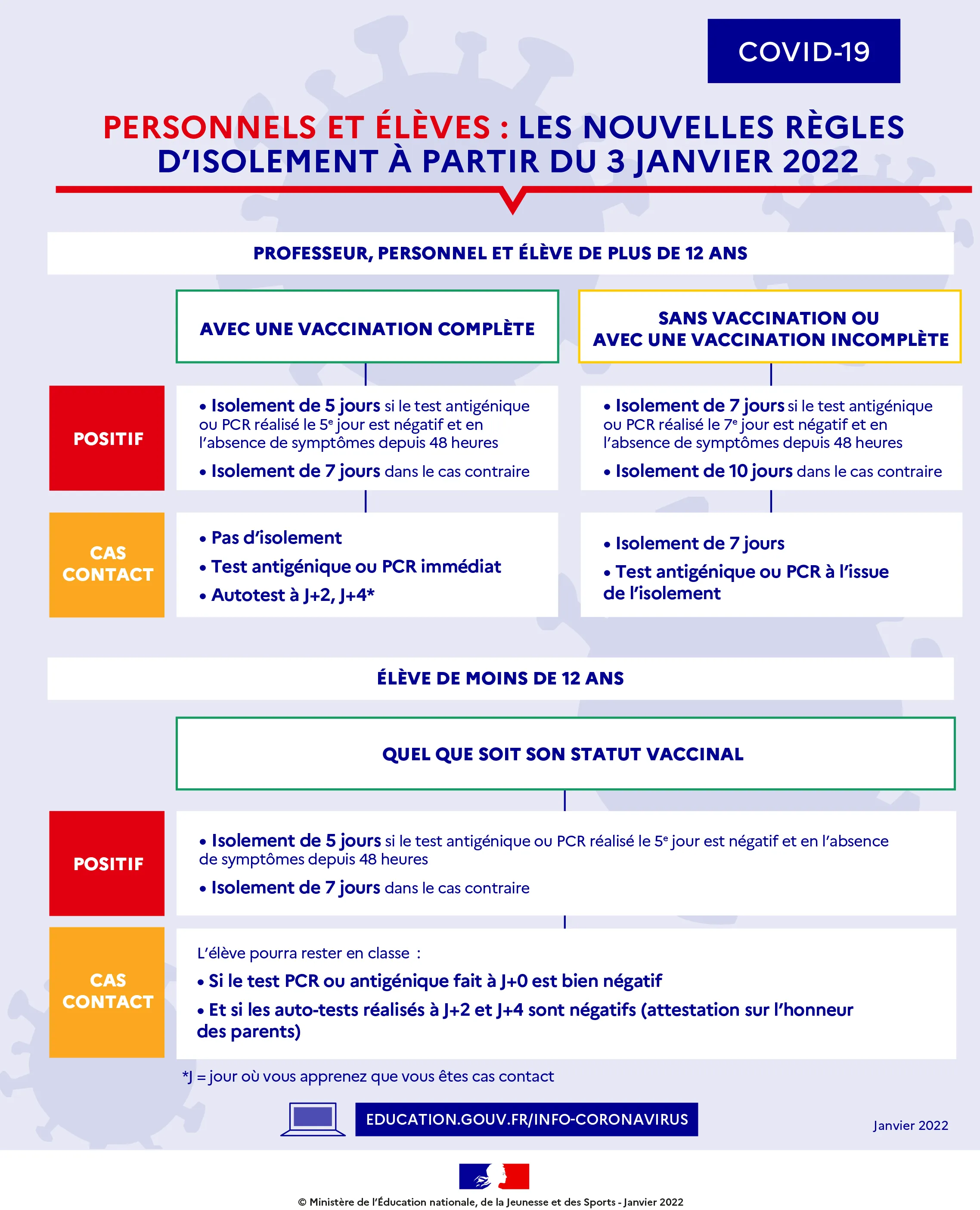 A partir de ce lundi 3 janvier, un élève de plus de 12 ans testé positif sera placé à l’isolement 7 jours maximum si son schéma vaccinal est complet, 10 dans le cas inverse.