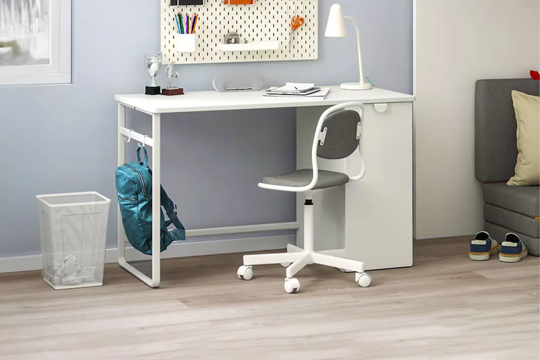 Le bureau et le caisson sont assez solides pour pouvoir y ranger des livres lourds ou toute autre affaire qui finit généralement par terre. Le rangement coulissant dispose de trois tablettes qui permettent de ranger des livres, des classeurs A4 et bien d'autres choses. Le bureau mesure 74 cm de haut, soit la hauteur qui conviendrait le mieux aux enfants !