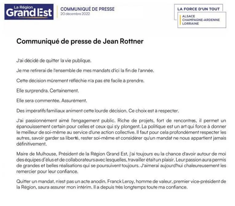 Dans un communiqué, Jean Rottner annonce son départ de la présidence de la Région Grand Est.