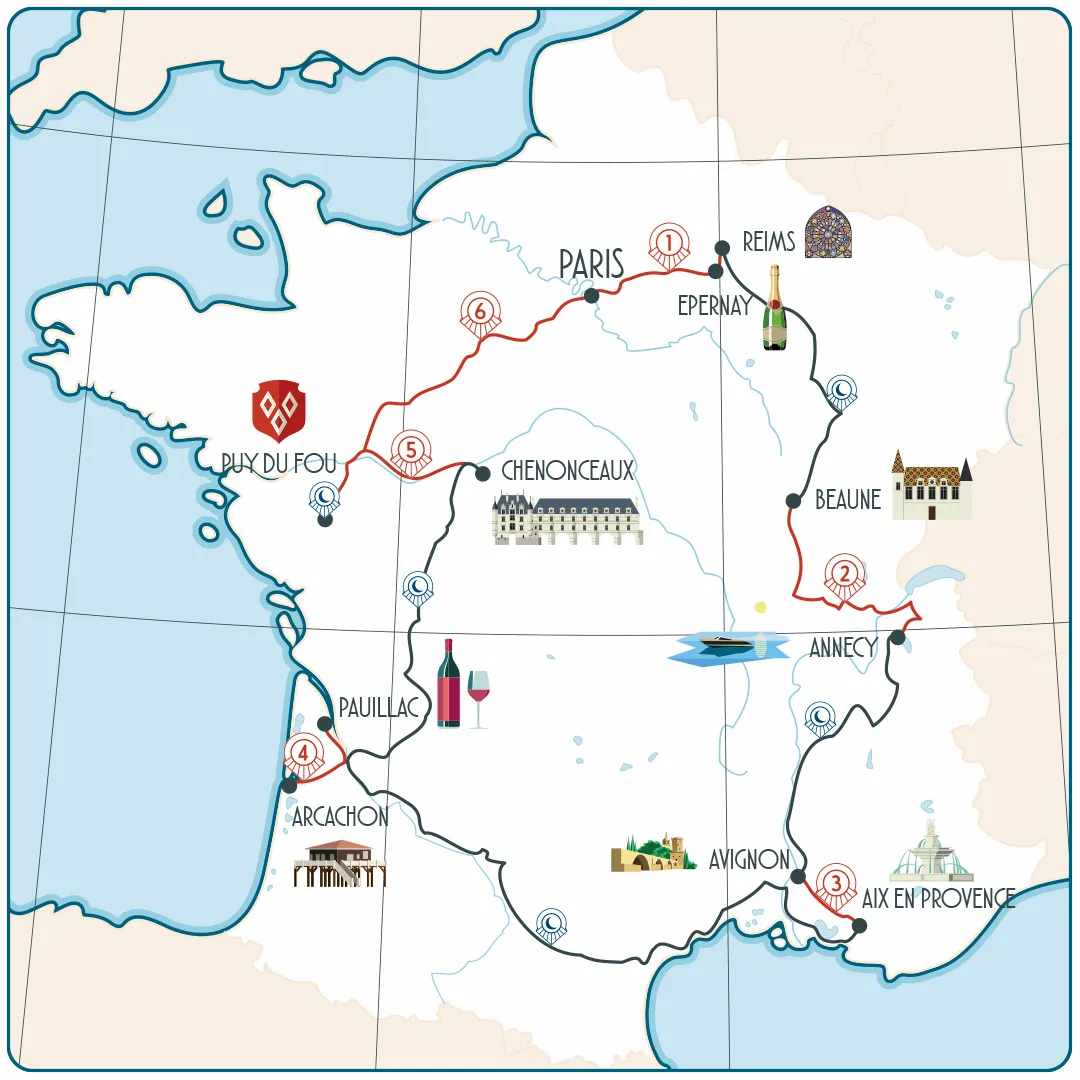 (*) Le train passera par Paris, Epernay, Reims, Beaune, Annecy, Avignon, Aix-en-Provence, Arcachon, Pauillac, Chenonceau et bien sûr, le Puy du Fou.
