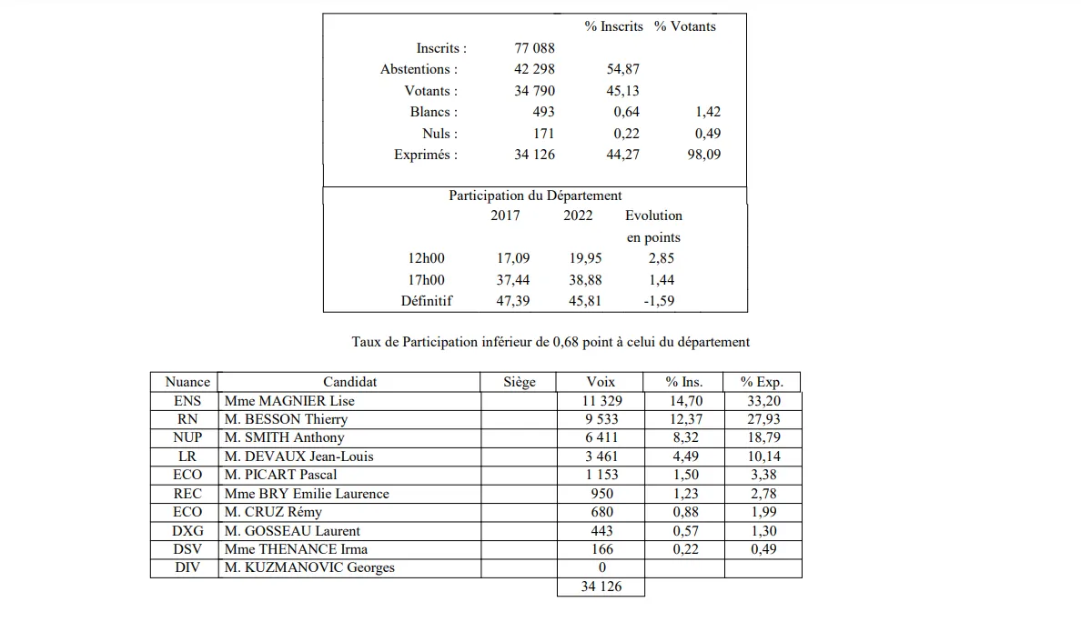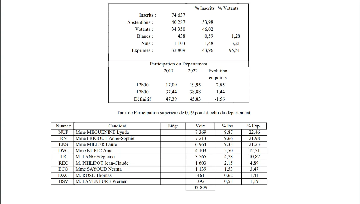 C'est la candidate de la NUPES Lynda Meguenne qui remporte ce premier tour avec près de 22,5% des voix, devant Anne-Sophie Frigout pour le RN (22%).