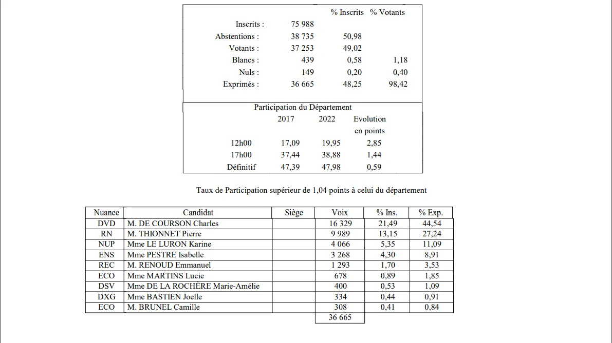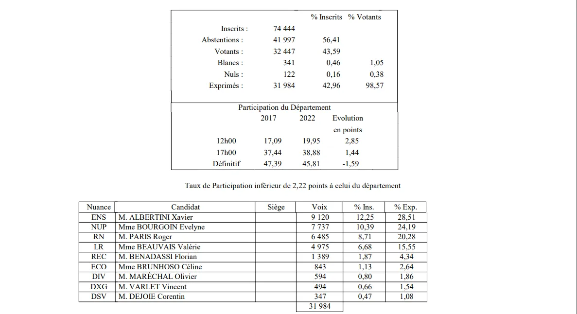 Dans la première circonscription, Xavier Albertini qui bénéficie du soutien de la majorité présidentielle, arrive en tête avec 28,5% des voix, devant la candidate de la NUPES, Evelyne Bourgoin (24,2%).