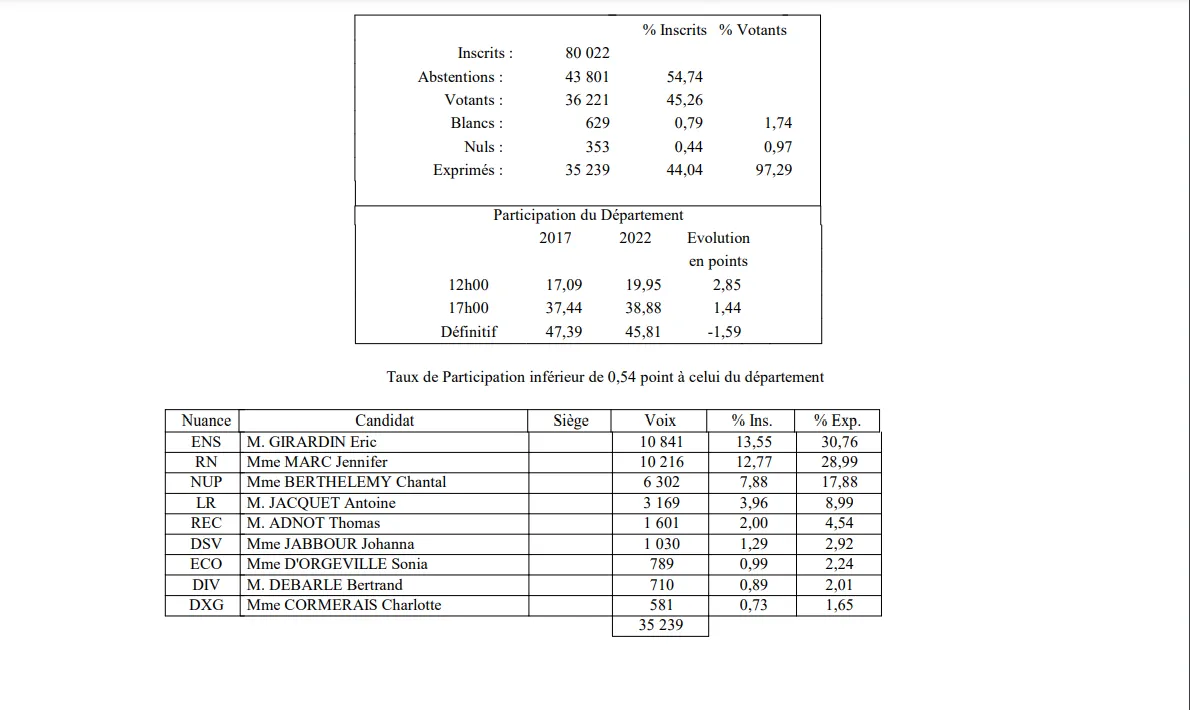 Match très serré dans la troisième, où le député sortant Eric Girardin arrive en tête (30,76%), devant Jennifer Marc pour le RN (28,99 %).