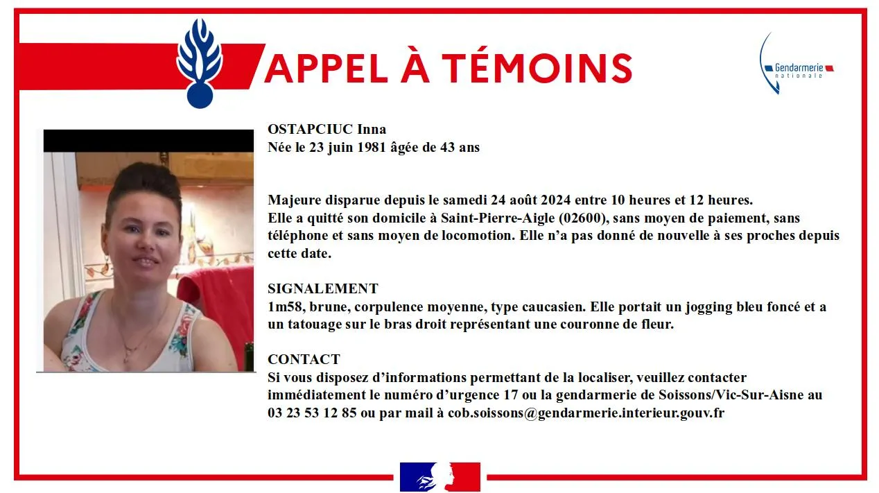 La gendarmerie de l'Aisne lance un appel à témoin pour retrouver Inna OSTAPCIUC âgée de 43 ans.