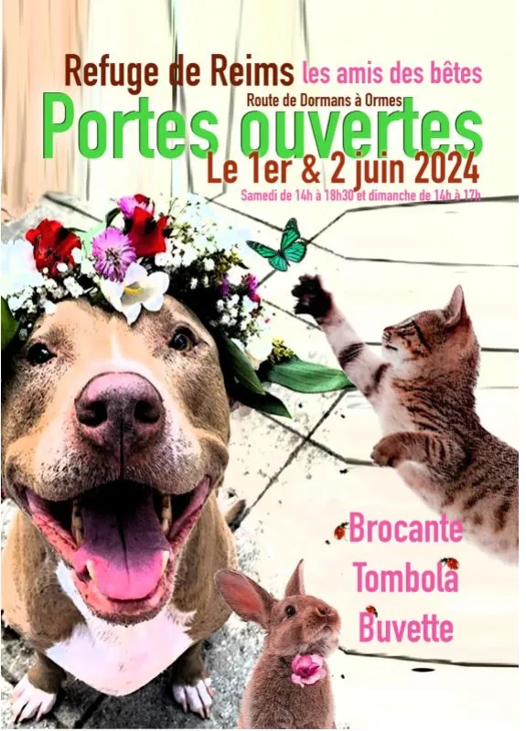À l'occasion de ses portes ouvertes , le refuge vous acceuille le samedi de 14h à 18h30 et le dimanche de 14h à 17h. route de Dormans à Ormes près de Reims. Au programme : brocante, tombola, buvettes, et surtout, la possibilité de rencontrer les animaux et d'échanger avec toute l’équipe du refuge.
