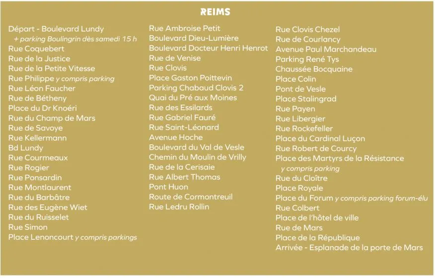 Dès 15h ce samedi , vous ne pourrez plus stationner sur le parking Boulingrin . Ensuite, à partir de 20 heures, l’interdiction de stationnement s’étendra aux autres zones situées sur les routes empruntées par les coureurs, notamment dans le centre-ville.