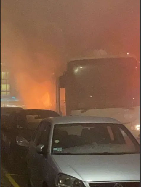 Un bus a pris feu, provoquant un épais nuage de fumée.