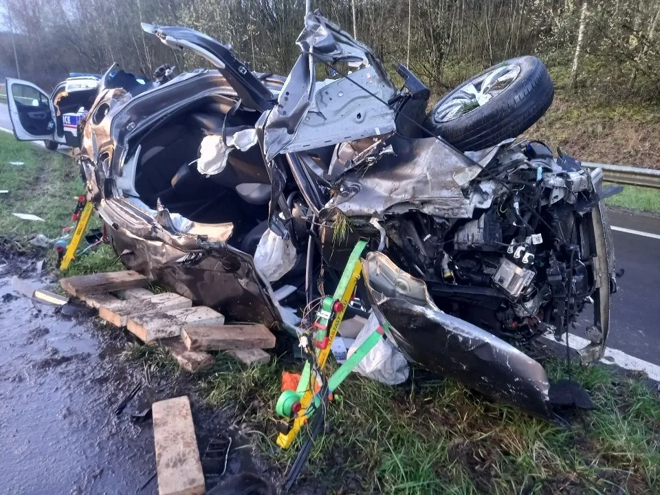 Un amas de ferraille informe, voilà ce qui reste de la voiture accidentée tôt ce samedi matin sur l’autoroute A34.