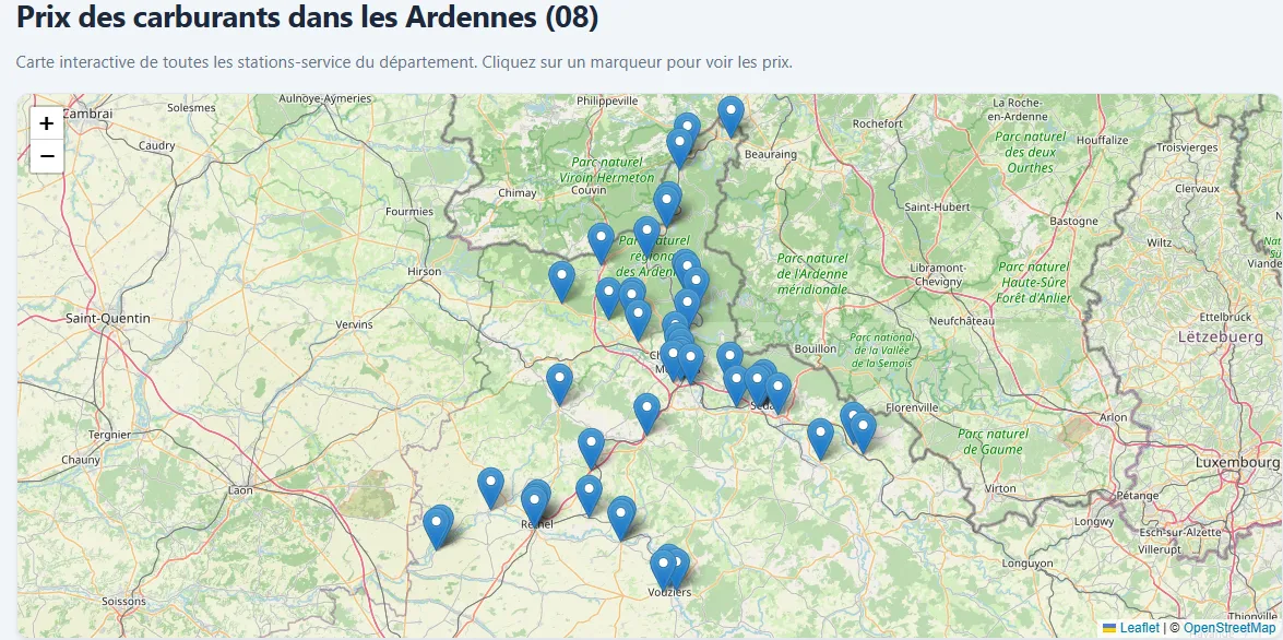Le site internet propose une lisibilité plutôt claire des stations les moins chères - du jour - à Sedan, Charleville, Rethel, Givet notamment, avec des données actualisées chaque heure. « Ces informations sont transmises directement par les distributeurs via une API gouvernementale mise à jour chaque heure », explique le fondateur Christophe Vincent. « La loi impose cette transparence aux établissements livrant plus de 500 m³ par an pour un carburant donné. Il est donc normal que certains ne communiquent pas sur le Sans Plomb 95 si leurs volumes de vente annuels sont insuffisants. » explique Christophe Vincent le fondateur.
